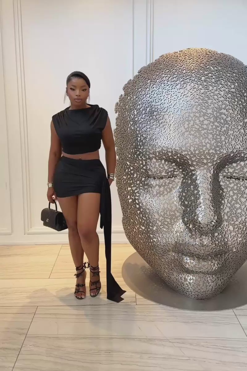 The Noir Siren Set is a head-turning two-piece designed for women who command the room. The draped cowl crop top adds soft sophistication, while the figure-hugging mini skirt with cascading side detail creates fluid movement and drama. Effortless yet daring, this set transitions seamlessly from candlelit dinners to late-night lounges.